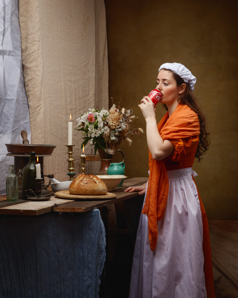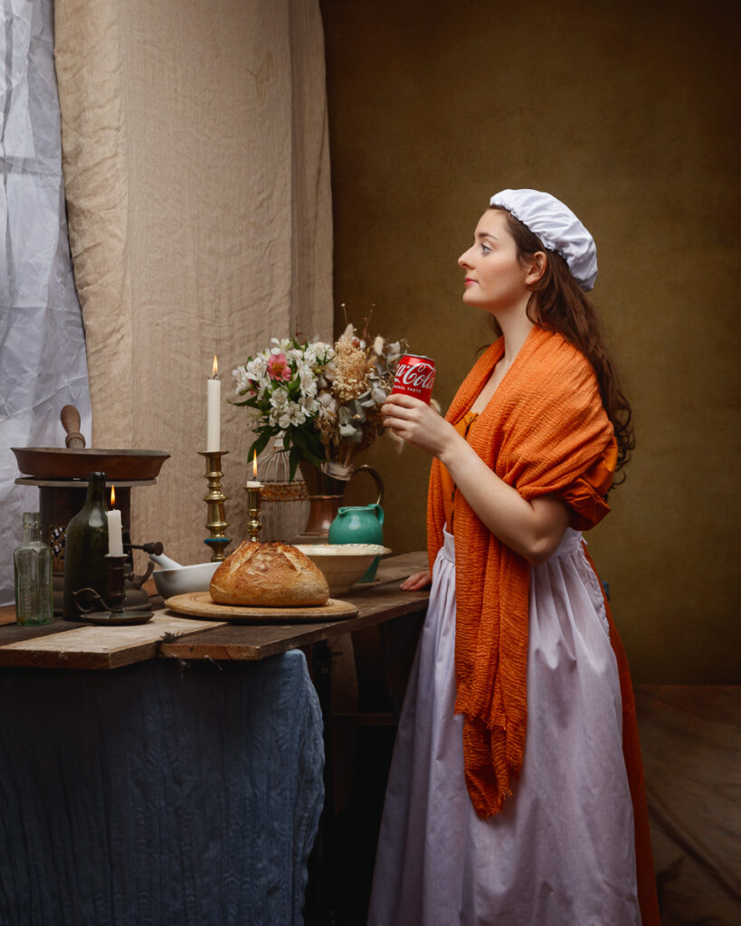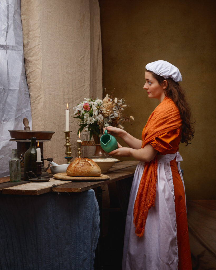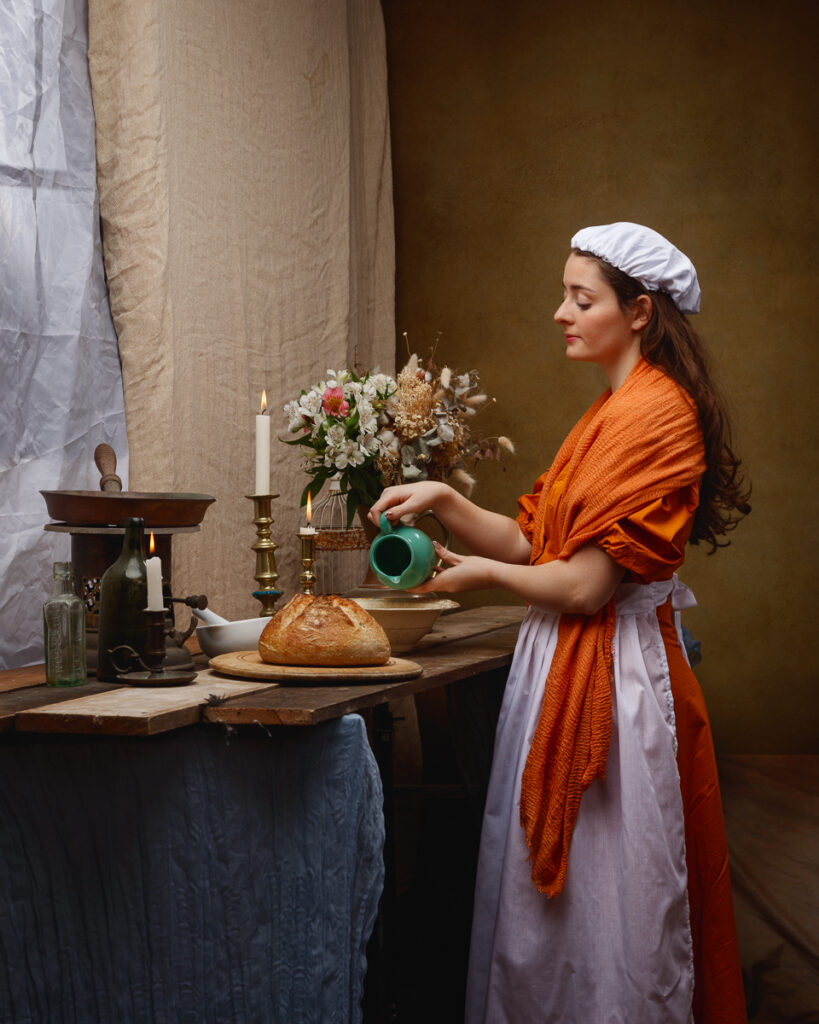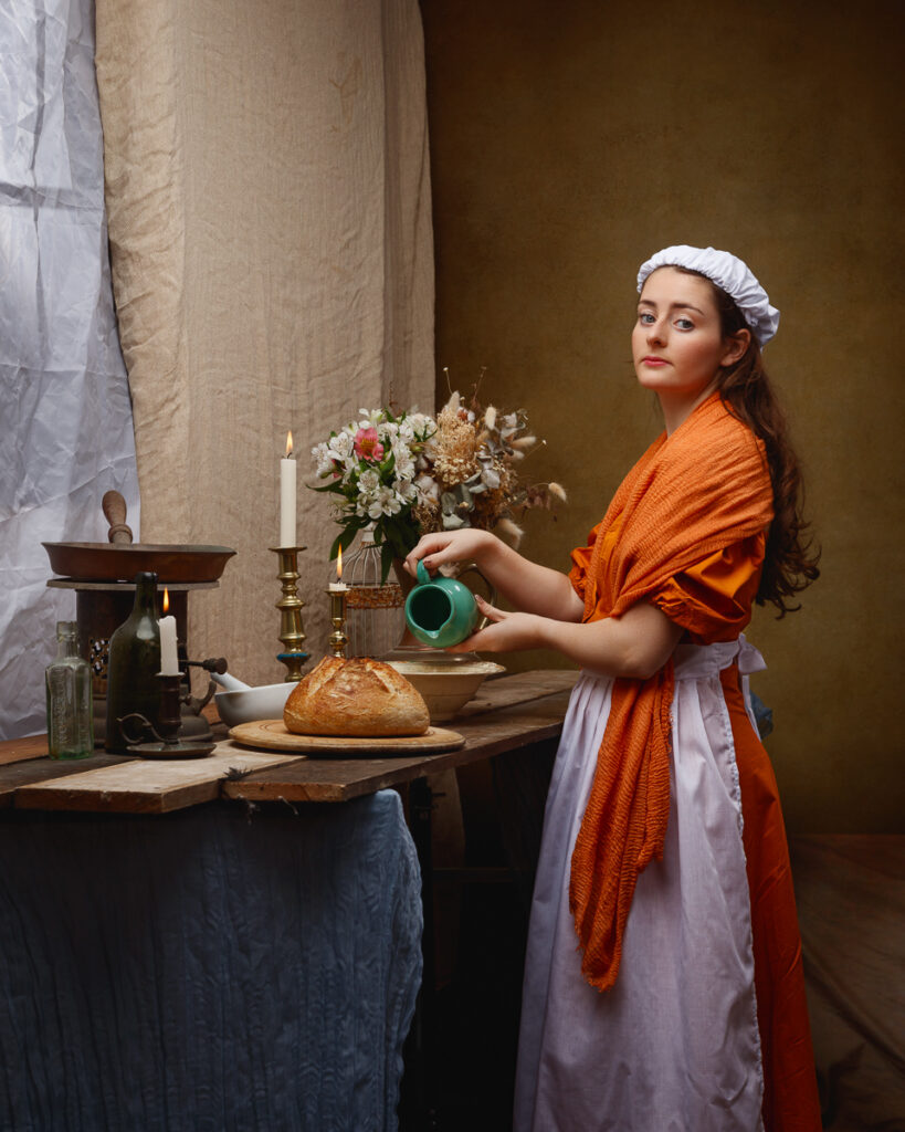 This portrait builds on the familiar domestic quiet of Vermeer’s The Milkmaid. I wanted the light to feel gentle and directional, so it falls across the hands and face in a soft arc. The set includes bread, flowers, pottery, and a single lit candle to echo the measured stillness seen in Dutch interiors. The muted backdrop and warm tones in the clothing help create a calm mood, rooted in routine and concentration. The orange shawl adds warmth and introduces a subtle contrast that feels true to Vermeer’s palette. The styling includes a rust coloured dress, an apron, and a simple cap to complete the scene.