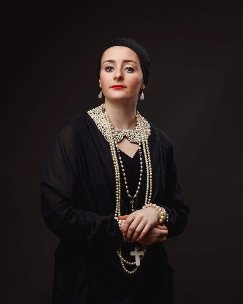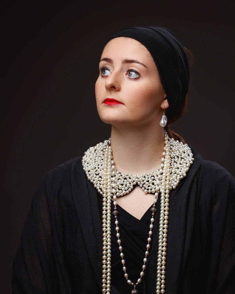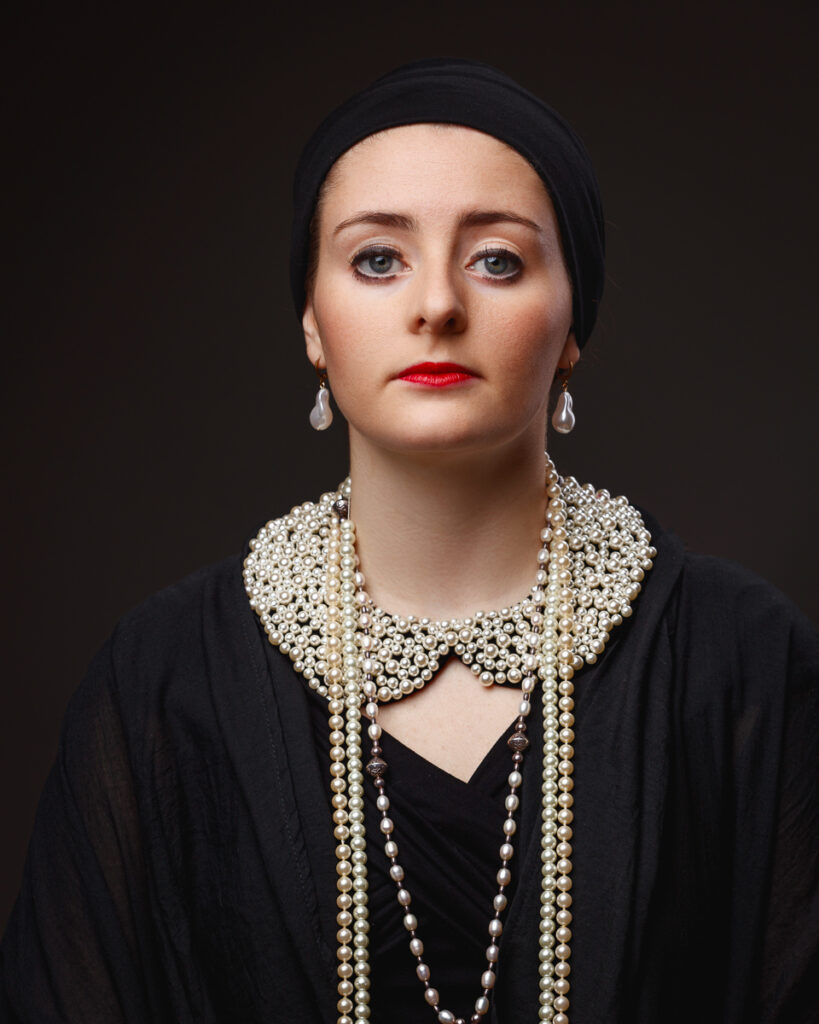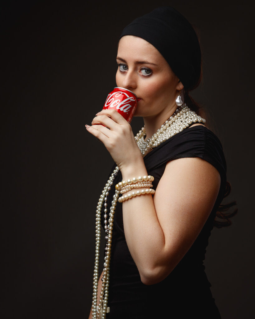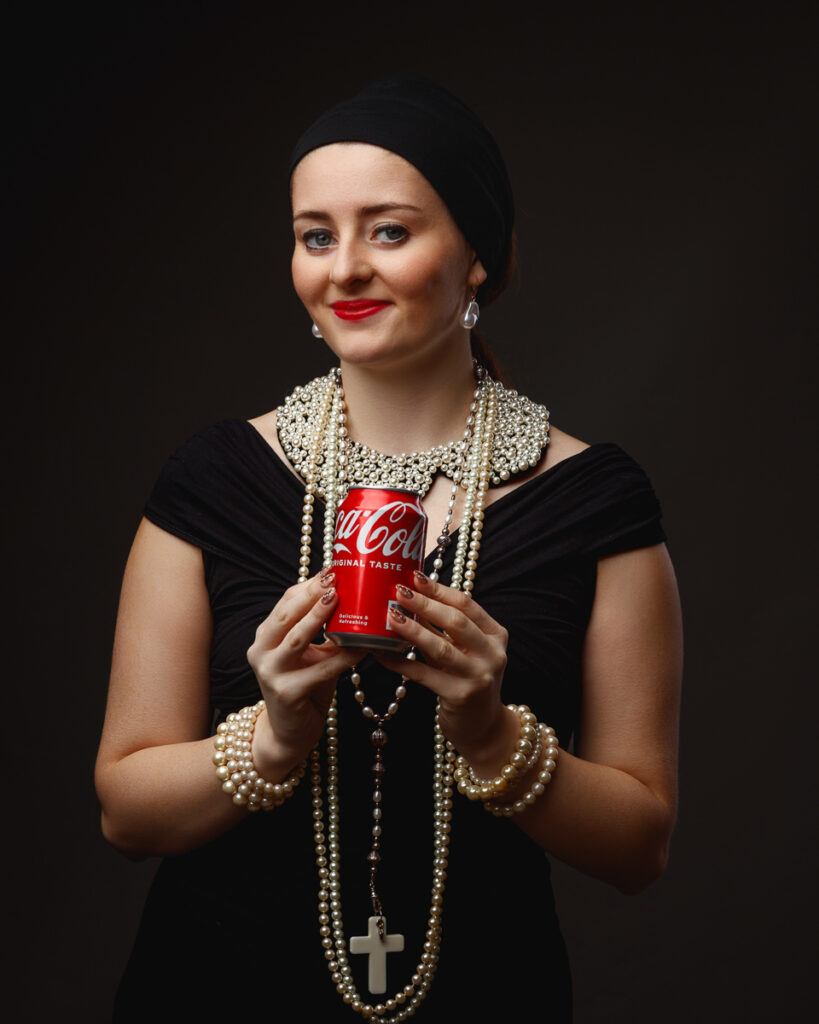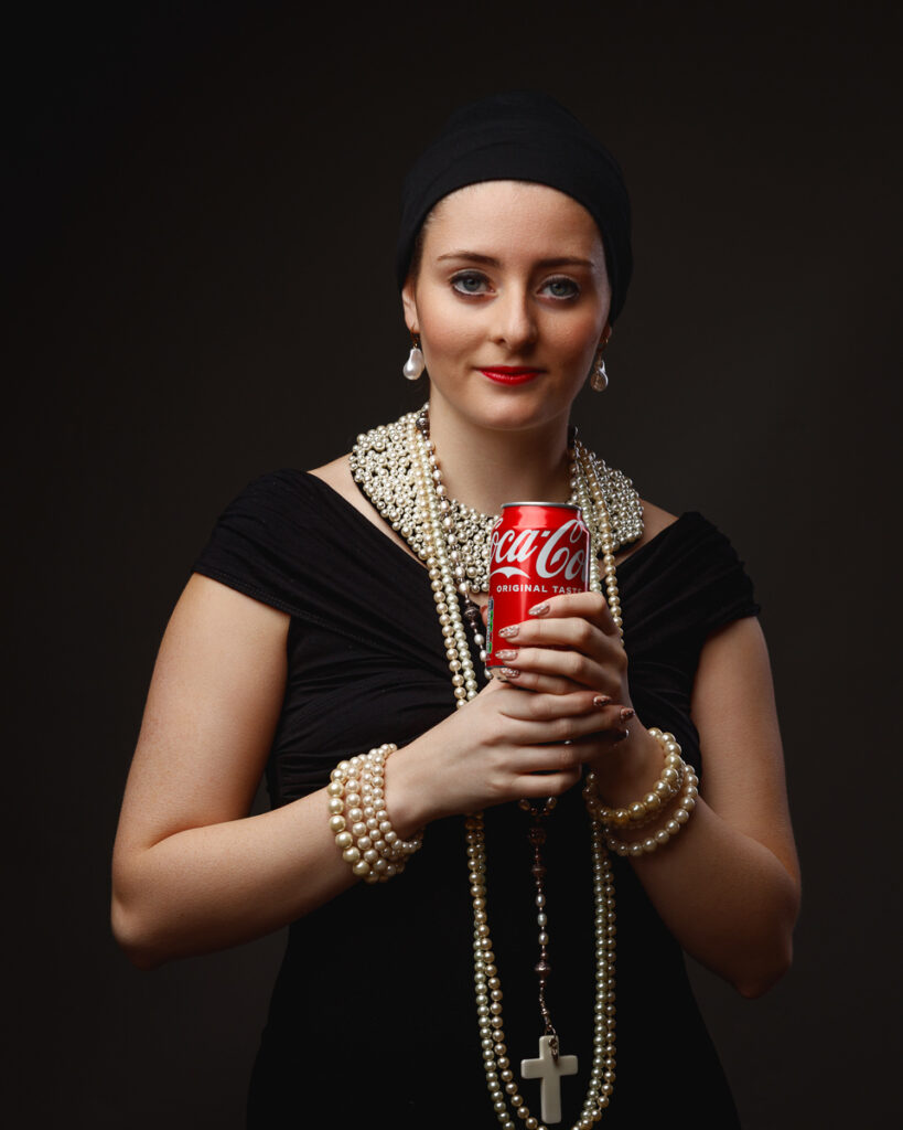 The final section of the series moves forward in time to the early twentieth century. Here, the styling shifts into the influence of Coco Chanel, whose work redefined elegance through simplicity, structure, and confidence. The layers of pearls, the clean lines of black fabric, and the refined pose all speak to Chanel’s vision. At the same time, the lighting approach reflects the sculptural quality found in Man Ray’s portraits. A soft frontal setup helps the pearls stand out while carving shape into the face. The dark background allows the details to stand clear without distraction. In one of the images, a modern detail appears in the form of a Coca Cola can. This small addition brings together two cultures of style: the luxury of early twentieth century Paris and a piece of contemporary global branding. The contrast between these worlds adds a playful comment on how fashion and identity shift over time.