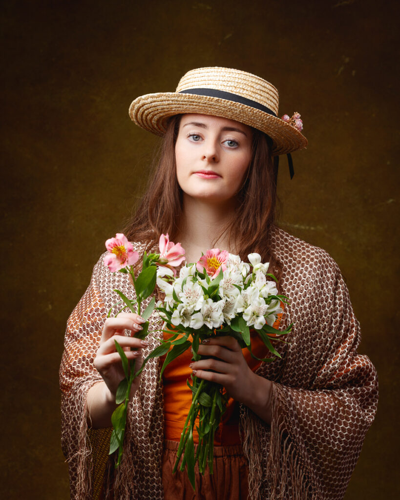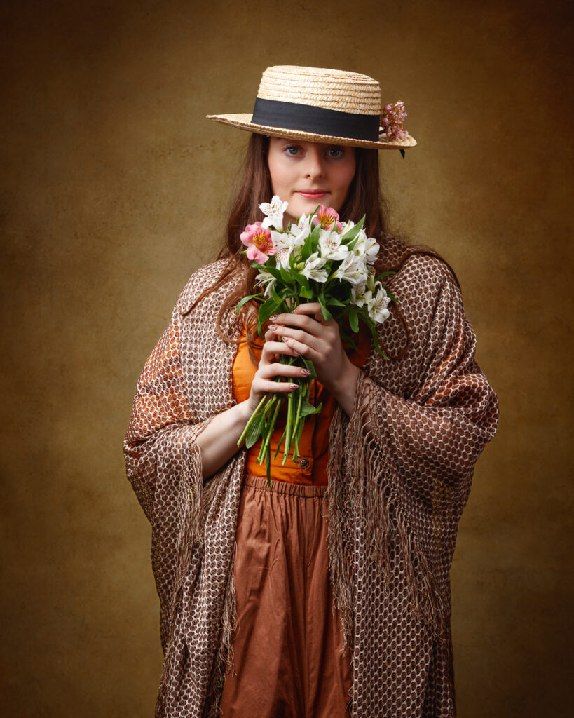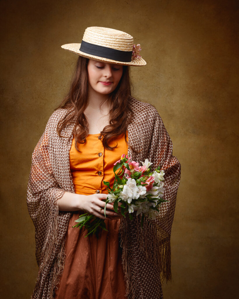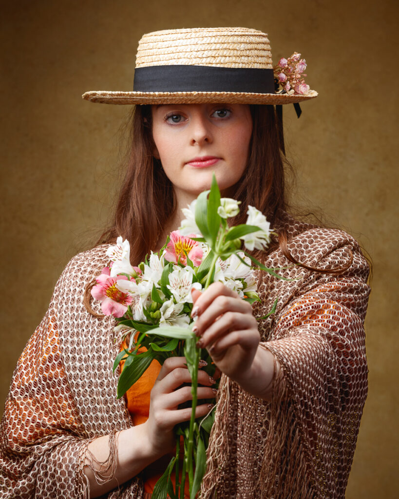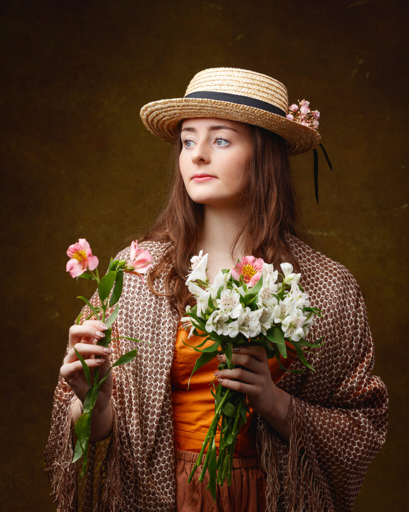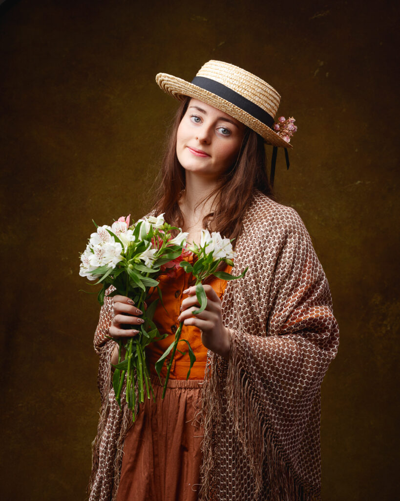 This image takes its cue from Manet’s Jeanne (Spring). In that painting, the model is poised and bright, with a direct gaze softened by a bouquet of fresh flowers. I wanted to carry over that same mix of freshness and restraint. Sophia wears a straw hat and a warm orange top that sits comfortably within the botanical theme. The brown lace shawl adds texture and frames the flowers in a natural way. The lighting is clean and frontal to keep the portrait crisp and luminous, which helps maintain the straightforward simplicity that defines Manet’s work. The outfit includes a rust dress, a tiered brown skirt, a lace shawl, and the classic boater hat.