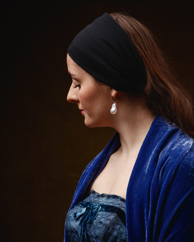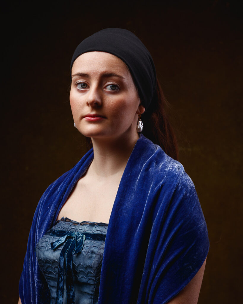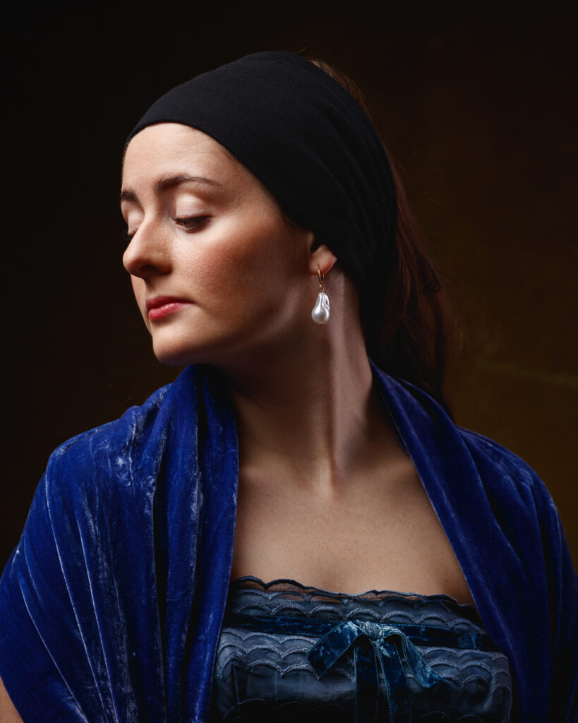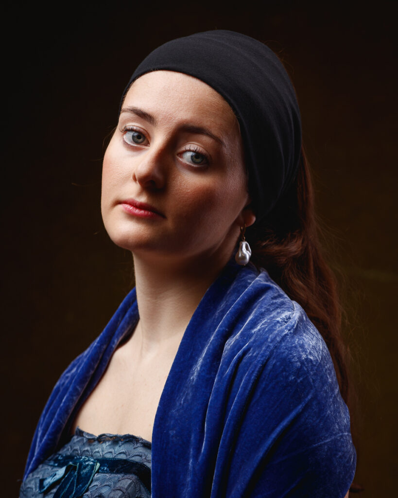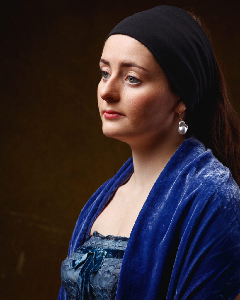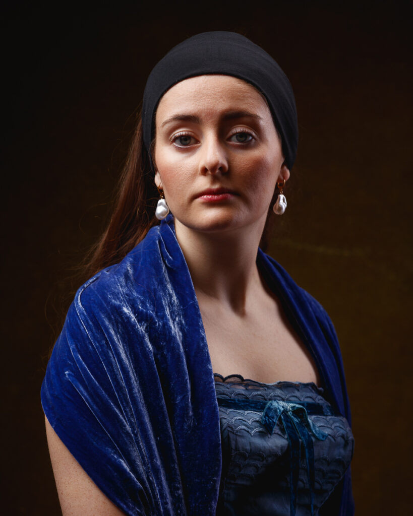 This interpretation echoes one of the most recognisable portraits in art. The pose is simple and controlled, with the face turned toward the light and the eyes steady and calm. I wanted the lighting to shape the portrait in a sculptural way, using a single soft key light to build gentle shadows along the cheek and neck. This keeps the mood quiet and intimate, much like the original painting. The styling brings together a blue velvet shawl, a blue lace gown, and a single pearl earring. These elements provide a nod to Vermeer’s love of texture, colour, and refined detail.